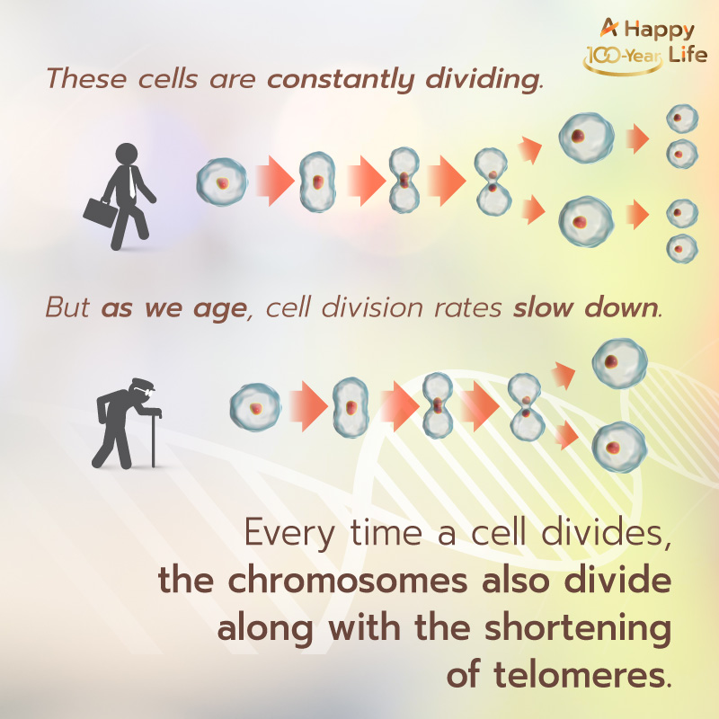 As a result, the body’s rebuilding process deteriorates, making it susceptible to various diseases and the lifespan is shortened. When telomeres shorten to the utmost, cells are unable to divide and will eventually decay.